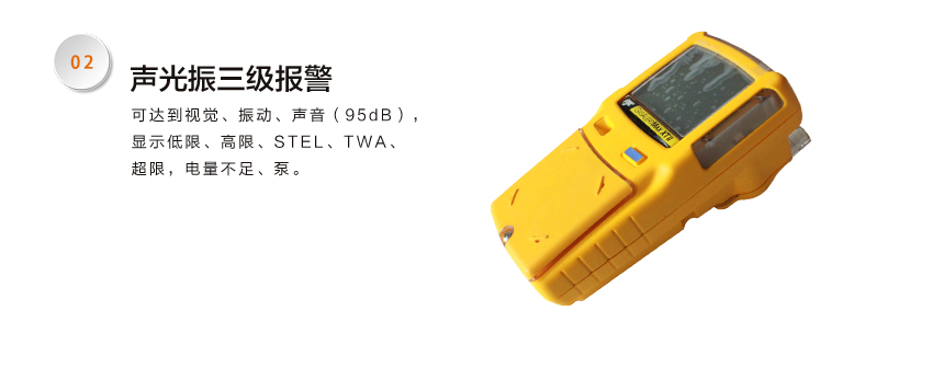 4、報警:視覺、振動、聲音(95dB),低限、高限、STEL、TWA,電量不足、泵。