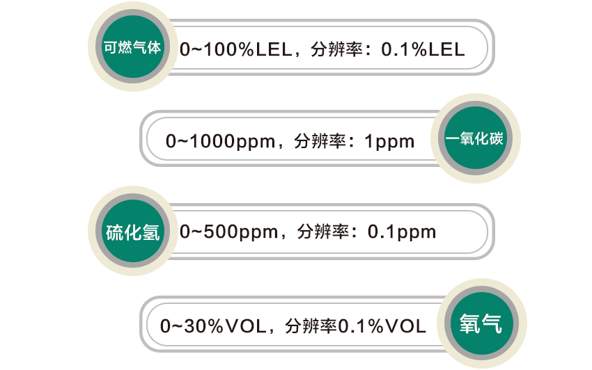 可燃?xì)怏w0~100%LEL,分辨率0.1%LEL; 甲烷:0~5%VOL,分辨率0.01%VOL; 氧氣:0~30%VOL,分辨率0.1%VOL; 一氧化碳0~1000ppm,分辨率1ppm; 硫化氫0~500ppm,分辨率0.1ppm |