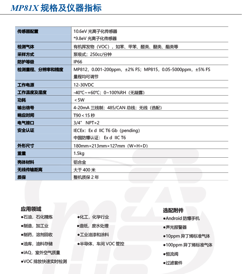 MP81X是一款可以在*端惡劣環境中工作的固定式光離子檢測儀,專利技術傳感器設計以及溫度控制單元可以確保不受冷凝水影響,提高在惡劣環境中檢測可靠性;高穩定性以及長壽命光源可以大大減少客戶維護量以及使用成本;藍牙遙控以及手機App兩種操作模式,無需開蓋,輕松提高現場維護效率;OLED顯示屏即使在強光下依然清晰可見,*大提高了對現場危險因素響應速度;包括現場無線傳輸在內的多種數據傳輸方式,可被廣泛的應用在石油、石化、化工、制造加工行業、VOC有組織以及無組織排放檢測、半導體車間VOC控制等行業。